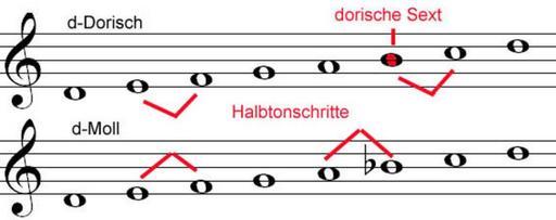 Keywords: Dorische Sext.jpg de Vergleich d-Dorisch mit d-Moll own Balliballi Cc-zero Musical scales in E