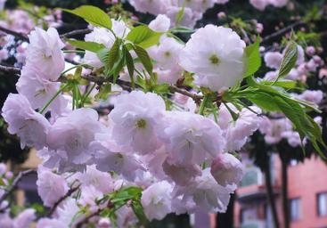 Keywords: double cherry blossoms flowers pale pink leaf green tokyo takanawa japan