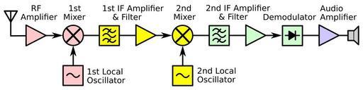 | Keywords: Double-conversion superheterodyne receiver block diagram.svg double-conversion superheterodyne receiver a more sophisticated version of the superheterodyne receiver invented in 1918 by Edwin Armstrong and used in many modern radio receivers In order to achieve both good adjacent channel selectivity and image rejection the double-conversion receiver uses two intermediate frequencies IFs The incoming radio frequency RF signal from the antenna is first mixed with a sinusoidal signal from the 1st local oscillator LO to give a high 1st IF frequency Since the separation between the RF and the image frequency is twice the 1st IF this high IF results in wide separation between the RF and the image allowing the image filter in the RF amplifier to reject the image Then this 1st IF is mixed with a 2nd local oscillator frequency to give a lower 2nd IF This lower IF allows the 2nd IF filter to have a narrow bandwidth giving the receiver good adjacent channel selectivity Then the 2nd IF is demodulated to extract the modulation from the radio frequency signal and the audio is amplified and applied to the speaker 2016-01-06 own Chetvorno other versions cc-zero Superheterodyne circuits Uploaded with UploadWizard |