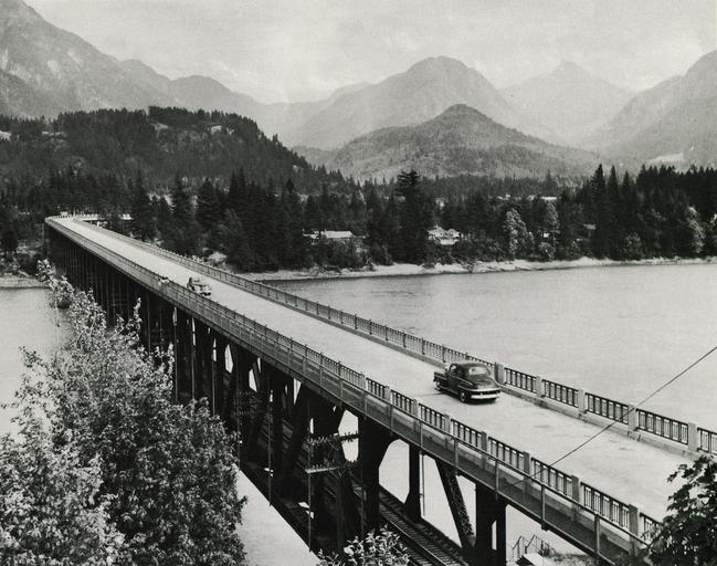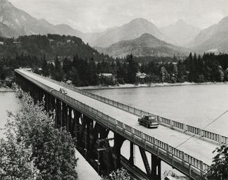 | Keywords: vehicle train outdoor railroad Double-deck bridge over the Fraser River at Hope, BC. View looking east. Built to link the CPR mainline at Haig Station to Hope as part of the Kettle Valley Railroad through the Coquihalla Pass to Princeton and into the southern interior. Currently used for the Trans-Canada Highway (Hwy. 1) crossing at the north end of Hope. Railway tracks have been removed. [BC Gov't photo] Double-deck bridge over the Fraser River at Hope, BC. View looking east. Built to link the CPR mainline at Haig Station to Hope as part of the Kettle Valley Railroad through the Coquihalla Pass to Princeton and into the southern interior. Currently used for the Trans-Canada Highway (Hwy. 1) crossing at the north end of Hope. Railway tracks have been removed. [BC Gov't photo] |