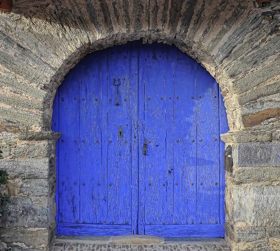 Keywords: double doors blue entrance exit archway arch building architecture home residential doorway wooden closed bricks structure