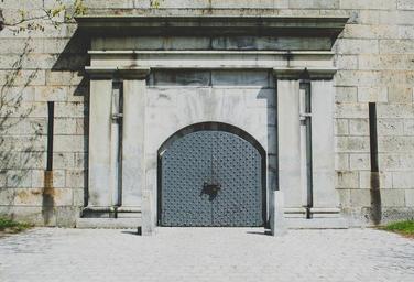 Keywords: double doors entrance exit building arched architecture gateway doorway columns closed archway stones blocks symbol