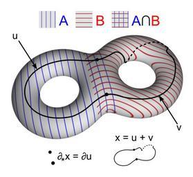 | Keywords: DoubleTorusCover.png en Illustration of the boundary map ˆ‚<sub> </sub> for the Mayer-Vietoris sequence on the double-torus where the 1-cycle x u + v is the sum of two 1-chains whose boundary lies in the intersection of A and B Own work using POV-Ray and Inkscape Based on a drawing by User GeometryGirl public domain RobHar 2008-12-18 Data file The double-torus was produced using POV-Ray v3 6 using the following code include colors inc include shapes inc include textures inc include functions inc camera location <-0 5 3 -2> look_at <0 0 0> //Striped textures declare bluestripes texture pigment gradient y colour_map 0 rgb <0 0 1>0 15 rgb <1 1 1> scale 0 1 finish ambient 0 3 rotate <0 0 90> declare redstripes texture pigment spiral1 1 colour_map 0 rgb <0 8 0 0>0 25 rgb <1 1 1> scale 0 1 finish ambient 0 3 declare blueredstripes texture pigment spiral1 1 colour_map 0 rgb <0 8 0 0>0 25 rgb <1 1 1> scale 0 1 finish ambient 0 3 texture pigment gradient y colour_map 0 rgb <0 0 0 8>0 15 rgb <1 1 1> filter 1 scale 0 1 finish ambient 0 3 rotate <0 0 90> declare Blob_threshold 0 0001; declare double_torus isosurface function //Smoothed sum of two level surfaces 1+Blob_threshold -pow Blob_threshold f_torus x+0 6 y z 0 5 0 2 -pow Blob_threshold f_torus x-0 6 y z 0 5 0 2 contained_by box <-1 5 -0 3 -0 9> <1 5 0 3 0 9> //Set containing box default is too small max_gradient 15 //Red part object double_torus clipped_by plane -x -0 15 texture redstripes //Blue part object double_torus clipped_by plane x -0 15 texture bluestripes //Intersection part object double_torus clipped_by plane x 0 15 clipped_by plane -x 0 15 texture blueredstripes //Empty background plane <0 1 0> -2 no_image light_source <0 1 5 -2> color White Algebraic topology Blobs Created_with_Persistence_of_Vision Isosurfaces |