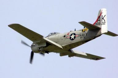 | Keywords: Douglas.skyraider.flying.arp.jpg Douglas Skyraider at Kemble Airfield Gloucestershire England This Douglas AD-4NA Skyraider 126922 is painted to represent an A-1H '402' of the VA-176 'Thunderbolts' squadron on the USS Intrepid during 1967 This aircraft was originally with the US Marine Corps and later served with the French Air Force in 1960 and the Gabonaise Air Force in 1976 It is painted as a A-1H AD-6 of attack squadron VA-176 Thunderbolts which was assigned to Attack Carrier Air Wing Ten CVW-10 during a deployment to Vietnam on the aircraft carrier USS Intrepid CVS-11 from 4 April to 21 November 1966 The real aircraft AK-402 was actually A-1H BuNo 134472 It was later transferred to the South Vietnam Air Force Flown to Thailand in 1975 it is now on display in the Royal Thai Air Force Museum in US Air Force colours http //www airliners net/open file/1173720/M Skyraiders first went in to service in 1945 This aircraft is privately owned and UK registered as G-RAID Photographed by Adrian Pingstone in June 2005 and released to the public domain Arpingstone G-RAID aircraft Aircraft at Cotswold Airport 2005 in aviation in the United Kingdom June 2005 in Gloucestershire |