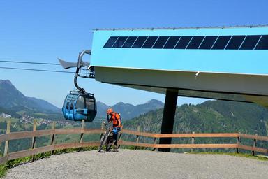 Keywords: downhill biker gondola ski lift mountains sport extreme sports mountain bike freeride sky partly cloudy