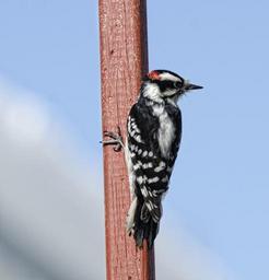 Keywords: downy woodpecker bird wildlife nature perched tree portrait looking