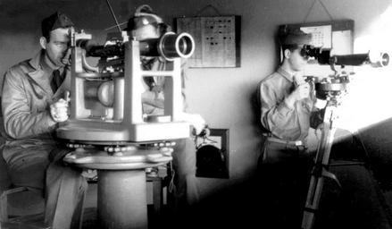 | Keywords: DPF and Azimuth Scope.jpg This image shows a depression position finder DPF on the left and an azimuth scope on the right Both instruments could be used to measure the azimuth of a target from the observation station; the DPF could also be used to measure the range to the target The DPF was normally installed with its heavy steel base bolted to an octagonal concrete pad that protruded 6 inches or so from the floor of the observation station An azimuth scope was usually supported by a portable tripod as shown here although it could also be mounted to a concrete-filled steel pipe The pintle center of the DPF the cylindrical mount-point in the center of the upper platform with the H -shaped trusses to its front and rear was taken as the point being observed from and its latitude and longitude were precisely determined by survey techniques This position was used in triangulating the position of the observed target This position was often also marked by means of a brass survey marker emplaced in the roof of the fire control structure directly above the pintle center location The operator of the DPF is seated on a wooden bench using the DPF to waterline a target placing the crosshairs on the ship's waterline just under its forward mast When the operator indicated that he had the target sighted correctly the talker to his left wearing the telephone set would read the azimuth and possibly also the distance to the target off of dials on the DPF and repeat these data to the plotting room where they were used in the fire control process The azimuth scope was often used in the process of spotting the fall of fire shell splashes from the battery being directed and to call out corrections to the battery's aim over short left or right The cross-shaped wooden standard hanging on the wall behind the DPF in this photo is a guide for spotting shell splashes Spotting was not always used however It was argued that adjusting fire in this manner could reduce rather than improve its accuracy This photo taken by the U S Coast Artillery has been said to be sited in a fire control station at Fort Standish on Lovells Island in Boston MA It has been re-cropped and adjusted for brightness and contrast by the contributor with editing artefacts removed Government image PD-USGov Original upload log en wikipedia Ktr101 CommonsHelper en wikipedia DPF_and_Azimuth_Scope jpg 2010-09-29 13 17 Pgrig 800×467× 89379 bytes <nowiki>This image shows a depression position finder DPF on the left and an azimuth scope on the right Both instruments could be used to measure the azimuth of a target from the observation station; the DPF could also be used to measure the range to the targe</nowiki> 2010-05-12 20 35 Pgrig 800×467× 127286 bytes <nowiki>The instrument on the left is a Depression Position Finder DPF The one on the right is an azimuth telescope The observer at the DPF targets a distant ship by putting the vertical crosswire of his instrument on the ship's forward funnel and the horizo</nowiki> Fire control towers |