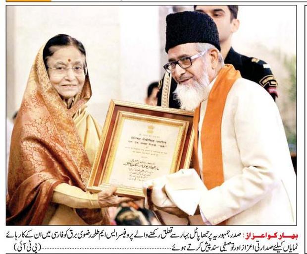| Keywords: Dr. Talha Rizvi Barque Receiving Award from President of India.jpg Uploaded with en wp UW marker 2013 02 20 Prof Dr Talha Rizvi Barque awarded by President of India for his special contribution and achievements in Persian Language and Literature investiture ceremony in Ashoka Hall President House New delhi<br/> Previously published Qaumi Tanzeem PTI Urdu Daily Patna 2012-06-19 Trbarque ;Other information Dr Talha Rizvi Barque A renowned writer and Poet superannuated Professor from V K S U ARA cc-zero 2012 in literature |