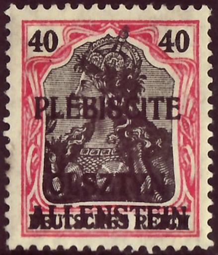 | Keywords: DRAbstG 1920 All MiNr07 B002a.jpg Stamp of the German Empire - plebiscite area Allenstein Germania-issue war press from 1914/15 with three-lines black ovewrprint in Latin capital letters PLÉBISCITE / OLSZTYN / ALLENSTEIN <br /> Stamp Michel No 7 Michel No 90IIb war press with overprint ; Yvert Tellier No 7 DR-AL ; AFA No 7 DR-AL <br /> Color red-carmine / brown-black<br /> Nominal value 40 Pfennig <br /> Watermark Germany No 1 rhombs <br /> Postage validity - 1920-04-03 1920-08-20 scan of original other date 1920-04-03 first issue day of the stamp Deutsche Reichspost - Commission d'administration et de plébiscite Olsztyn - Allenstein PD-Polish PD-Germany-§134-KUG 1917 Philately Germania-issue war press of 1914/15 with three-lines black ovewrprint in Latin capital letters PLÉBISCITE / OLSZTYN / ALLENSTEIN <br /> other date 1920-04-03 Deutsche Reichspost - Commission d'administration et de plébiscite Olsztyn - Allenstein Creator Paul Eduard Waldraff Reichsdruckerei Berlin letterpress printing comb perforation K 14 14¼ Deutsche Abstimmungsgebirte - Allenstein Nr 7 1920 stamps of Olsztyn 07_1 Overprints on Germania stamps |