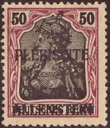 | Keywords: DRAbstG 1920 All MiNr08 B002.jpg Stamp of the German Empire - plebiscite area Allenstein Germania-issue war press from 1914/15 with three-lines black ovewrprint in Latin capital letters PLÉBISCITE / OLSZTYN / ALLENSTEIN <br /> Stamp Michel No 8 Michel No 91IIx war press ; Yvert Tellier No 8 DR-AL ; AFA No 8 DR-AL <br /> Color crimson / brown-black on light chrome yellow<br /> Watermark Germany No 1 rhombs <br /> Nominal value 50 Pfennig <br /> Postage validity - 1920-04-03 1920-08-20 scan of original other date 1920-04-03 first issue day of the stamp Deutsche Reichspost - Commission d'administration et de plébiscite Olsztyn - Allenstein PD-Polish PD-Germany-§134-KUG 1917 Philately Germania-issue war press of 1914/15 with three-lines black ovewrprint in Latin capital letters PLÉBISCITE / OLSZTYN / ALLENSTEIN other date 1920-04-03 Deutsche Reichspost - Commission d'administration et de plébiscite Olsztyn - Allenstein Creator Paul Eduard Waldraff Reichsdruckerei Berlin letterpress printing comb perforation K 14 14¼ Deutsche Abstimmungsgebiete - Allenstein Nr 8 1920 stamps of Olsztyn 08_1 Overprints on Germania stamps |