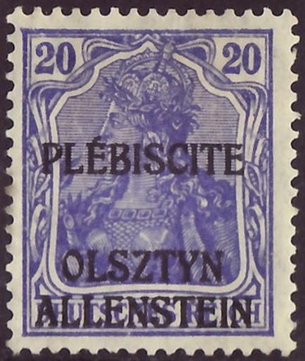| Keywords: DRAbstG 1920 All MiNr5b B002.jpg Stamp of the German Empire - plebiscite area Allenstein Germania-issue war press from 1914/15 with three-lines black ovewrprint in Latin capital letters PLÉBISCITE / OLSZTYN / ALLENSTEIN <br /> Stamp Michel No 5b Michel No 87IId with overprint ; Yvert Tellier No 5 DR-AL ; AFA No 5 DR-AL <br /> Color violet blue<br /> Nominal value 20 Pfennig <br /> Watermark Germany No 1 rhombs <br /> Postage validity - 1920-04-03 1920-08-20 scan of original other date 1920-04-03 first issue day of the stamp Deutsche Reichspost - Commission d'administration et de plébiscite Olsztyn - Allenstein PD-Polish PD-Germany-§134-KUG 1917 Philately Germania-issue war press of 1914/15 with three-lines black ovewrprint in Latin capital letters PLÉBISCITE / OLSZTYN / ALLENSTEIN other date 1920-04-03 Deutsche Reichspost - Commission d'administration et de plébiscite Olsztyn - Allenstein Creator Paul Eduard Waldraff Reichsdruckerei Berlin letterpress printing comb perforation K 14 14¼ Deutsche Abstimmungsgebiete - Allenstein Nr 5 1920 stamps of Olsztyn 05_1 Overprints on Germania stamps |