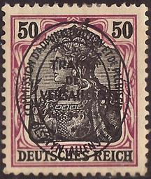 | Keywords: DRAbstG 1920 Allenstein MiNr22 B002.jpg Stamp of the German Empire - plebiscite area Allenstein ; definitive stamp; Germania-issue mostly war press from 1914/15 with black standing oval ovewrprint of the Entente-commission<br /> Stamp Michel No 22 Michel No 91IIx war press with overprint ; Yvert Tellier No 22 DR-AL ; AFA No 22 DR-AL <br /> Color violet crimson / brownblack on dull chrome yellow<br /> Watermark Germany No 1 rhombs <br /> Nominal value 50 Pfennig <br /> Postage validity - 1920-05 1920-08-20 scan of original other date 1920-05 first issue of the stamp Deutsche Reichspost - Commission d'administration et de plébiscite Olsztyn - Allenstein PD-Polish PD-Germany-§134-KUG 1917 <gallery> File Germania Marke jpg The same stamp without overprint Michel No 91II </gallery> Philately Germania-issue war press of 1914/15 with black standing oval ovewrprint of the Entente-commission other date 1920-05 Deutsche Reichspost - Commission d'administration et de plébiscite Olsztyn - Allenstein Creator Paul Eduard Waldraff Reichsdruckerei Berlin letterpress printing comb perforation K 14 14¼ Deutsche Abstimmungsgebiete - Allenstein No 22 1920 stamps of Olsztyn 22_1 Overprints on Germania stamps |