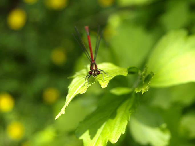 Keywords: dragonfly red insect flight insect wing nature adonis dragonfly adonis maiden small dragonfly filigree persevere head garden eyes shiny close wait transparent wing skeleton sit summer leaf