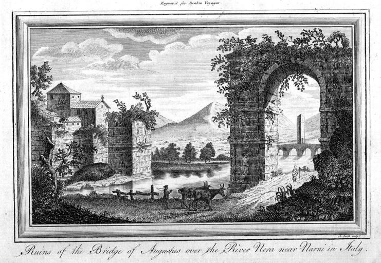 | Keywords: Drake, Edward Cavendish - A new Universal Collection of Authentic and Entertaining Voyages and Travels - 1768.JPG Edward Cavendish Drake ' Ruins of the bridge of Augustus over the river Nera near Narni in Italy From A new Universal Collection of Authentic and Entertaining Voyages and Travels 1768 PD-Art Engravings of buildings Edward Cavendish Drake Stone arch bridges in Italy Narni Ponte d'Augusto Narni in art Nera River Artworks missing infobox template | ||||