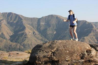 Keywords: drakensberg hiking happy woman tourist traveler hill top