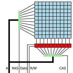 | Keywords: DRAM.svg Organization of a semiconductor Dynamic RAM DRAM chip Each bit of data is stored a memory cell The cells blue blocks are laid out in an array of rows and columns on the chip The memory address applied to the chip A is broken into two parts; a row address which is decoded by a row address decoder green rectangle left to select one row of cells and a column address which is decoded by a column address decoder green rectangle bottom to select one of the cells in the active row When the Row Address Strobe RAS line is asserted the row of memory cells is activated transferring the bit of data in each cell to the sense amplifiers red blocks When the Column Address Strobe CAS line is asserted the column address decoder picks the bit from one column to output on the Data line <br /> The write process is similar except that the Read/Write R/W line is asserted so instead of reading a bit a bit of data on the Data line is written by the selected sense amplifier into the memory cell Own 2008-03-05 HandigeHarry PD ImageNote 1 189 7 205 206 400 400 2 Memory cells ImageNoteEnd 1 ImageNote 2 91 46 26 124 400 400 2 Row address decoder ImageNoteEnd 2 ImageNote 3 182 228 216 44 400 400 2 Sense amplifiers ImageNoteEnd 3 ImageNote 4 231 291 121 27 400 400 2 Column address decoder ImageNoteEnd 4 DRAM 10x10 arrays |