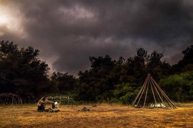 Keywords: dramatic clouds camp encampment cloudscape dark field thunderstorm scene man dog outdoors exposed storm