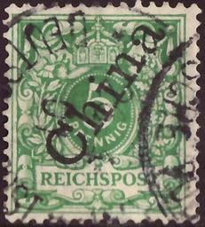 | Keywords: DRAus 1898 China MiNr02II B002.jpg Stramp of the German Empire - German post offices abroad China ; 1898; issue German Empire from 1889 with overprint<br /> Stamp German Empire - German post offices abroad China Michel No 2II; AFA No 2 DR-CHI ; Reichspost ; drawing of 1889 Michel No 46c Number in standing oval with imperial crown ; stamp with single-line 56°-transverse black overprint China in Latin letters<br /> Color blueish green<br /> Nominal value 5 Pfennig<br /> Watermark none<br /> Postage validity - 1898-12 1902-03-31 <br /> scan of original other date 1898-12 first issue day of the stamp <br /> other date 1901-04-26 date of postmark Deutsche Reichspost - Deutsche Post in China PD-China PD-Germany-§134-KUG 1917 <gallery> File DR 1889 46 Krone jpg The same stamp without overprint Michel No 46 mint color variant </gallery> Philately Reichspost - drawing from 1889; Number in standing oval with Imperial crown; with overprint single-line 56°-transverse black Latin letters China other date 1898-12 Deutsche Reichspost - Deutsche Post in China Reichsdruckerei Berlin letterpress printing comb perforation; K 13½ 14¼ 1898 stamps of Germany for China S2_02_2 Overprints on stamps of Germany |