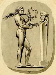 | Keywords: Drawing of an intaglio - a youth with a herm.jpg en Glass paste intaglio engraved with a terminal figure of Hermes before which stands a youth holding a wreath and palm-branch in his left hand and a cock on his right see BM Cat Gem 2794 Pen and ink with grey wash and traces of graphite underdrawing on a sheet of paper which is stuck down onto a second sheet watermarked 'J WHATMAN' together with 2010 5006 1021 - 1026; the assemblage framed in a graphite border 1768 - 1805 http //www britishmuseum org/research/search_the_collection_database/search_object_details aspx objectid 3360476 partid 1 searchText 2010 2c5006 1023 fromADBC ad toADBC ad numpages 10 images on orig 2fresearch 2fsearch_the_collection_database aspx currentPage 1 British Museum collection Charles Townley 1737-1805 Custom license marker 2012 05 08 PD-Art Uploaded with UploadWizard Hermai in art Intaglios |