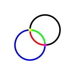 | Keywords: DrawingExample.svg Examples for longbowflag and swapflag in the A-Parameter in the SVG-path-element The arc is drawn from the yellow to the magenta dot ;Red Longbowflag 0 swapflag 0 code <code>d M 200 200 A 100 100 0 0 0 300 300 </code> ;Green Longbowflag 0 swapflag 1 code <code>d M 200 200 A 100 100 0 0 1 300 300 </code> ;Blue Longbowflag 1 swapflag 0 code <code>d M 200 200 A 100 100 0 1 0 300 300 </code> ;black Longbowflag 1 swapflag 1 code <code>d M 200 200 A 100 100 0 1 1 300 300 </code> 2010-04-26 own Antonsusi Linked circles |