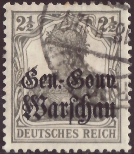 | Keywords: DRBesG 1916 War MiNr06 B002.jpg Stamp of the German Empire - German occupation areas 1914/18 - Poland; definitive stamp Germania-issue war press with black two lines overprint in German letters Gen -Gouv / Warschau for the General-Gouvernement Warschau <br /> Stamp Michel No 6 German Empire Nr 98 1916 with overprint ; Yvert Tellier No 6 Poland PL-OA <br /> Color grey to brown olive-grey<br /> Watermark Germany No 1 rhombs <br /> Nominal value 2½ Pfennig <br /> Postage validity - 1916-08-01 1918-12-28 scan of original other date 1916-08-01 first issue day of the stamp Deutsche Reichspost - Deutsche Post in Polen PD-Germany-§134-KUG PD-Polish 1917 <gallery> File DR 1916 98 Germania jpg The same stamp without overprint Michel No 98 mint color variant </gallery> Philately Germania-issue war press with black two lines overprint in German letters Gen -Gouv / Warschau other date 1916-08-01 Deutsche Reichspost - Deutsche Post in Polen Creator Paul Eduard Waldraff Reichsdruckerei Berlin letterpress printing comb perforation K 14 14¼ Deutsche Besetzungausgaben 1914/18 Deutsche Post in Polen Nr 6 1916 stamps of Germany for Poland 06_2_1 Overprints on Germania stamps Grey stamps |