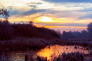 Keywords: dream frost water ice frozen sky blue orange trees plant nature morning light landscape clouds daybreak hill sunlight sunrise sun mirroring fog out of focus effect blurry
