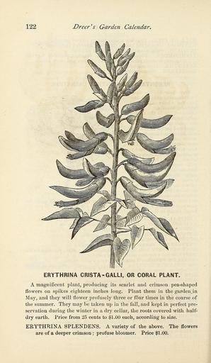 Keywords: Dreer's garden calendar (16442069171).jpg 122 <br> Dreer s Garden Calendar <br> ERYTHRINA CRISTA - GALLI OR CORAL PLANT <br> A magnificent plant producing its scarlet and crimson pea-shaped <br> flowers on spikes eighteen inches long Plant them in the garden in <br> May and they will flower profusely three or four times in the course of <br> the summer They may he taken up in the fall and kept in perfect pre- <br> servation during the winter in a diy cellar the roots covered with half- <br> dry earth Price from 25 cents to 1 00 each according to size <br> ERYTHRINA SPLENDENS A variety of the above The flowers <br> are of a deeper crimson ; profuse bloomer Price 1 00 43927978 150164 77662 Page 122 Text http //www biodiversitylibrary org/page/43927978 1884 10 5962/bhl title 77662 Henry A Dreer Firm ; Henry G Gilbert Nursery and Seed Trade Catalog Collection NameFound Erythrina crista NameFound Erythrina splendens NameConfirmed Erythrina splendida Diels EOLID 644484 NameBankID 707734 Biodiversity Heritage Library Dreer's garden calendar 1875 Garden Stories Catalogs Flowers Gardening Henry A Dreer Firm Internet resource Nursery stock Seeds U S Department of Agriculture National Agricultural Library bhl page 43927978 dc identifier http //biodiversitylibrary org/page/43927978 bhlGardenStories Coral Plant BHLinbloom henry a dreer firm u s department of agriculture national agricultural library bhlgardenstories coral plant bhlinbloom Information field Flickr posted date ISOdate 2015-02-04 Check categories 2015 August 24 CC-BY-2 0 BioDivLibrary https //flickr com/photos/61021753 N02/16442069171 2015-08-24 05 54 49 cc-by-2 0 PD-old-70-1923 Dreer's garden calendar Photos uploaded from Flickr by Fæ using a script |