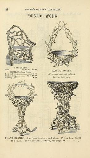 Keywords: Dreer's garden calendar (16657751729).jpg 88 treer's garden calendar <br> RUSTIC WOpK <br> m Â¥ <br> ARM CHAIRS <br> – – - – – ¢ - ' ' – hanging baskets <br> SETTEJ- S ” Same sttlz <br> F mr feet long SS 50 Of vaTzov sizes and patta-ns <br> Six feet Ions 12 to 15 00 <br> Rocking Chair 8 00 Sl 25 to 5 00 each <br> W ” <br> J £Sp <br> PLANT STANDS of various designs and sizes Prices from 85 00 <br> to 15 00 For other Rustic work see page 89 43925808 150131 77662 Page 88 Text http //www biodiversitylibrary org/page/43925808 1884 10 5962/bhl title 77662 Henry A Dreer Firm ; Henry G Gilbert Nursery and Seed Trade Catalog Collection Biodiversity Heritage Library Dreer's garden calendar 1874 Garden Stories Catalogs Flowers Gardening Henry A Dreer Firm Nursery stock U S Department of Agriculture National Agricultural Library bhl page 43925808 dc identifier http //biodiversitylibrary org/page/43925808 bhlGardenStories Rustic works BHLinbloom henry a dreer firm u s department of agriculture national agricultural library bhlgardenstories bhlinbloom Information field Flickr posted date ISOdate 2015-03-17 Check categories 2015 August 23 CC-BY-2 0 BioDivLibrary https //flickr com/photos/61021753 N02/16657751729 2015-08-24 00 52 44 cc-by-2 0 PD-old-70-1923 Dreer's garden calendar Photos uploaded from Flickr by Fæ using a script |