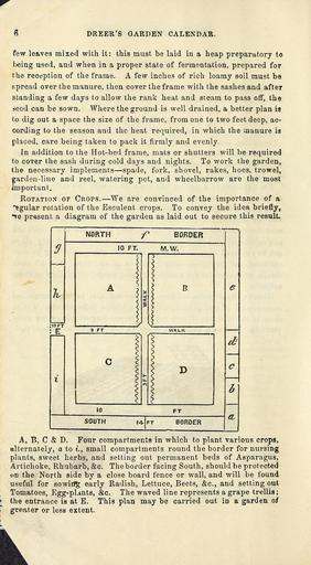 | Keywords: Dreer's garden calendar (16842783821).jpg H DREER'S GARDEN CALENDAR <br> few leaves mixed with it this must be laid in a heap preparatory to <br> being used and when in a proper state of fermentation prepared for <br> the reception of the frame A few inches of rich loamy soil must be <br> spread over the manure then cover the frame with the sashes and after <br> standing a few days to allow the rank heat and steam to pass off the <br> ieod can be sown Where the ground is well drained a better plan ia <br> to dig out a space the size of the frame from one to two feet deep ac- <br> cording to the season and the heat required in which the manure is <br> placed care being taken to pack it firmly and evenly <br> In addition to the Hot-bed frame mats or shutters will be required <br> to cover the sash during cold days and nights To work the garden <br> the necessary implements ” spade fork shovel rakes hoes trowel <br> jarden-liue and reel watering pot and wheelbarrow are the most <br> mportant <br> Rotation of Crops ” We are convinced of the importance of a <br> ' gular rotation of the Esculent crops To convey the idea briefly <br> ˘ e pr jsent a diagram of the garden as laid out to secure this result <br> h <br> NCRTH <br> r <br> BORDER <br> 10 FT <br> M W <br> ilOFT <br> E <br> 10 <br> SOUTH 14- FT BORDER <br> A B C D Four compartments in which to plant various crops <br> alternately a to i small compartments round the border for nursing <br> plants sweet herbs and setting out permanent beds of Asparagus <br> Artichoke Rhubarb c The border facing South should be protected <br> on the North side by a close board fence or wall and will be found <br> useful for sowiiJg early Radish Lettuce Beets c and setting out <br> Tomatoes Egg-pLtnts c The waved line represents a grape trellis; <br> the entrance is at E This plan may be carried out in a garden of <br> greater or less extent <br> L 43925720 150131 77662 Page 6 Text http //www biodiversitylibrary org/page/43925720 1884 10 5962/bhl title 77662 Henry A Dreer Firm ; Henry G Gilbert Nursery and Seed Trade Catalog Collection NameFound Asparagus NameConfirmed Asparagus var pygmaeus Makino EOLID 10487111 Biodiversity Heritage Library Dreer's garden calendar 1874 Garden Stories Catalogs Flowers Gardening Henry A Dreer Firm Internet resource Nursery stock Seeds U S Department of Agriculture National Agricultural Library bhl page 43925720 dc identifier http //biodiversitylibrary org/page/43925720 bhlGardenStories Crop rotation BHLinbloom henry a dreer firm u s department of agriculture national agricultural library bhlgardenstories bhlinbloom Information field Flickr posted date ISOdate 2015-03-17 Check categories 2015 August 24 CC-BY-2 0 BioDivLibrary https //flickr com/photos/61021753 N02/16842783821 2015-08-24 00 50 49 cc-by-2 0 PD-old-70-1923 Crop rotation Dreer's garden calendar Photos uploaded from Flickr by Fæ using a script |