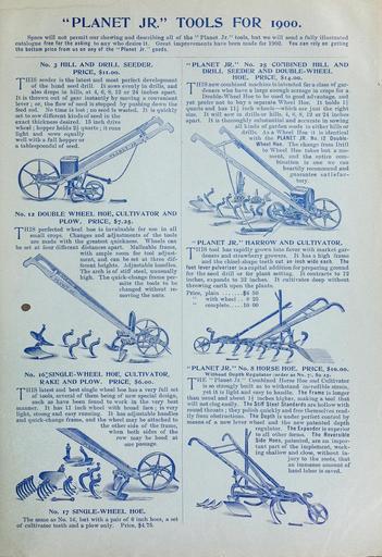 | Keywords: Dreer's quarterly wholesale price list of vegetable seeds flower seeds bulbs aquatics decorative plants hard plants tools implements etc., etc (15941271683).jpg PLANET JR TOOLS FOR 1900 <br> Space will not permit oar showing and describing all of the Planet Jr tools but we will send a fully illustrated <br> catalogue free for the asking to any who desire it Great improvements have been made foi 1900 You can rely on getting <br> the bottom price from us on any of the Planet Jr goods <br> No 3 HILL AND DRILL SEEDER <br> PRICE 11 00 <br> THIS seeder is the latest and most perfect development <br> of the hand seed drill It sows evenly in drills and <br> also drops in hills at 4 6 8 12 or 24 inches apart <br> It is thrown out of gear instantly by moving a convenient <br> lever ; or the flow of seed is stopped by pushing down the <br> feed rod No time is lost ; no seed is wasted It is quickly <br> set to sow different kinds of seed in the <br> exact thickness desired 15 inch drive <br> wheel ; hopper holds 2 quarts ; it runs <br> light and sows equally <br> well with a full hopper or <br> a tablespoonful of seed <br> No 12 DOUBLE WHEEL HOE CULTIVATOR AND <br> PLOW PRICE 7 25- <br> THIS perfected wheel hoe is invaluable for use in all <br> small crops Changes and adjustments of the tools <br> are made with the greatest quickness Wheels can <br> be set at four different distances apart Malleable frame <br> with ample room for tool adjust- <br> ment and can be set at three dif- <br> ferent heights Adjustable handles <br> The arch is of stiff steel unusually <br> high The quick-change frame per- <br> mits the tools to be <br> changed without re- <br> moving the nuts <br> No i6 SINQLE WHEEL HOE CULTIVATOR <br> RAKE AND PLOW PRICE 6 00 <br> THIS latest and best single wheel hoe has a very full set <br> of tools several of them being of new special design <br> such as have been found to work in the very best <br> manner It has 11 inch wheel with broad face ; is very <br> light strong and easy running It has adjustable handles <br> and quick-change frame and the wheel may be attached to <br> the other side of the frame <br> when both sides of the <br> PLANET JR No 25 COHBINED HILL AND <br> DRILL SEEDER AND DOUBLE WHEEL <br> HOE PRICE 14 00 <br> THIS new combined machine is intended for a class of gar- <br> deners who have a large enough acreage in crops for a <br> Double- Wheel Hoe to be used to good advantage and <br> yet prefer not to buy a separate Wheel Hoe It holds 1 <br> quarts and has 11 - inch wheels ” which are just the right <br> size It will sow in drills or hills 4 6 8 12 or 24 inches <br> apart It is thoroughly substantial and accurate in sowing <br> all kinds of garden seeds in either hills or <br> drills As a Wheel Hoe it is identical <br> with the PLANET JR No 12 Double- <br> Wheel Hoe The change from Drill <br> to Wheel Hoe takes but a mo- <br> ment and the entire com- <br> bination is one we can <br> heartily recommend and <br> ;uarantee satisfac- <br> tory <br> PLANET JR HARROW AND CULTIVATOR <br> THIS tool has rapidly grown into favor with market gar- <br> deners and strawberry growers It has a high frame <br> and the chisel-shape teeth cut an inch wide each The <br> foot lever pulverizer isacapital addition for preparing ground <br> for the seed drill or for plant setting It contracts to 12 <br> inches expands to 32 inches It cultivates deep without <br> throwing earth upon the plants <br> Price plain 8 50 <br> with wheel 8 25 <br> complete 10 00 <br> No 17 SINGLE WHEEL HOE <br> The same as No 16 but with a pair of 6 inch hoes a set <br> of cultivator teeth and a plow only Price 4 75 <br> PLANET JR No 8 HORSE HOE PRICE 10 00 <br> Without Depth Regulator order as No 7 9 25 <br> THE Planet Jr Combined Horse Hoe and Cultivator <br> is so strongly built as to withstand incredible strain <br> yet it is light and easy to handle The Frame is longer <br> than usual and about Ih inches higher making a tool that <br> will not clog easily The Stiff Steel Standards are hollow with <br> round throats ; they polish quickly and free themselves read- <br> ily from obstructions The Depth is under perfect control by <br> means of a new lever wheel and the new patented depth <br> regulator The Expander is superior <br> to all other forms The Reversible <br> Side Hoes patented are an impor- <br> tant part of the implement work- <br> ing shallow and close without in- <br> jury to the roots that <br> an immense amount of <br> hand labor is saved 43837591 149442 78185 Text http //www biodiversitylibrary org/page/43837591 1900 10 5962/bhl title 78185 Henry A Dreer Firm ; Henry G Gilbert Nursery and Seed Trade Catalog Collection Biodiversity Heritage Library Dreer's quarterly wholesale price list of vegetable seeds flower seeds bulbs aquatics decorative plants hard plants tools implements etc etc 1900 Garden Stories Bulbs Plants Catalogs Flowers Nurseries Horticulture Seeds Vegetables U S Department of Agriculture National Agricultural Library bhl page 43837591 dc identifier http //biodiversitylibrary org/page/43837591 bhlGardenStories Henry A Dreer Garden Tools BHLinbloom bulbs plants nurseries horticulture u s department of agriculture national agricultural library bhlgardenstories henry a dreer garden tools bhlinbloom Information field Flickr posted date ISOdate 2015-02-17 CC-BY-2 0 BioDivLibrary https //flickr com/photos/61021753 N02/15941271683 2015-08-24 23 52 14 cc-by-2 0 PD-old-70-1923 Dreer's quarterly wholesale price list of vegetable seeds flower seeds bulbs aquatics decorative plants hard plants tools implements etc etc Photos uploaded from Flickr by Fæ using a script |