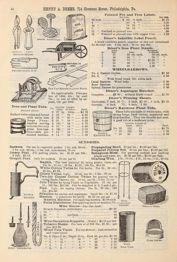 | Keywords: Dreer's quarterly wholesale price list of vegetable seeds flower seeds bulbs aquatics decorative plants hard plants tools implements etc., etc (16535437216).jpg HENRY A DREEE 714 Chestnut Street Philadelphia Pa <br> Painted Pot and Tree Labels <br> Per 1000 Per 1000 <br> SJinch 60 6 inch 1 25 <br> ASPARAGUS BUNCHEH <br> 4 No rights or lefts Price per <br> / box of 1000 60c ; by mail <br> 75c ; in lots of 50C0 by ex- <br> press 55c per 1000 <br> Tree and Plant Tubs <br> Painted Green <br> Madeof white cedar and bound <br> with extra iron <br> hoops D r op- <br> handles serving <br> as hooks for carry <br> poles Iron legs <br> I Removable per- <br> forated bottoms <br> No <br> 1 <br> 2 <br> 3 <br> 4 <br> 5 <br> 6 <br> 7 <br> Outside <br> Diam <br> 27 in <br> 25 <br> 23 <br> 21 <br> 19 <br> 18' <br> 16 <br> 15 <br> 14 <br> Length <br> of Stave <br> 24 in <br> 22 <br> 20 <br> 18 <br> 16 <br> 14 <br> 13 <br> 12 <br> 10 <br> Each <br> 4 75 <br> 4 25 <br> 3 60 <br> 3 25 <br> 2 75 <br> 2 50 <br> 2 CO <br> 1 75 <br> 1 50 <br> 65 8 <br> 70 10 <br> 90 12 <br> Notched or pierced tree <br> No <br> 1 <br> 2 <br> 3 <br> 4 <br> 5 <br> Galvanlied <br> or Bronxed <br> 55 cts <br> each <br> 70 <br> II <br> 1 00 <br> II <br> 1 15 <br> 11 <br> 1 40 ¢' <br> II <br> 2 50 <br> 3 50 <br> 4 50 <br> 60 <br> Notched or pierced tree with copper wire 1 00 <br> Dreer's Indelible Label Pencil <br> A black indelible pencil superior to any yet introduced <br> for florists' use 5 cts each ; 50 cts per doz <br> Dreer's Iron Plant Stands <br> Inches <br> taigb Plain <br> 15 45 cts each <br> 18 55 <br> 24 77 <br> 30 80 <br> 36 90 <br> WHE ELB ARROWS <br> No 4 Eastern Garden 3 50 <br> No 5 4 00 <br> With broad tread 25c extra each <br> Canal Barrows Wood body 2 <br> Boys' Barrows 2 <br> Special Narrow for greenhouse 3 <br> Dreer's Asparagus Buncher <br> Complete 2 00 ; without Knife Guard 1 75 <br> Dreer's Pruning Shears <br> Perfection 7 inch 1 75 ; 8 inch 2 00 ; 9 inch 2 25 <br> German 8 inch 75 ; 9 inch 1 00 <br> Dreer's Keystone Plant Tubs <br> These tubs are made of white cedar with <br> strong hoops fixed bottom unpainted and <br> drop-handles They are durable and neat <br> A good tub at a moderate price <br> Outside Length of <br> Diam Stave <br> No 12 13 13 <br> 15 16 16 <br> Dreer's iq on 1Q <br> Keystone Tub ° <br> 00 <br> 00 <br> 00 <br> Each <br> 0 75 <br> 1 25 <br> 2 00 <br> SUNDRIES <br> Baskets <br> 1 bu oak <br> Jersey Peat <br> 5bbls 5 0 <br> Oregon Peat <br> For use in vegetable garden bu oak 50 cts ; <br> 60 cts ; 1 bu oak iron-bound 75 cts <br> For potting plants etc 1 25 per bbl ; <br> Propagating Sand 50 per bu ; 1 00 per bbl <br> Prepared Potting Soil 50 cts per bus ; 1 00 per bbl <br> Sphagnum Moss For growing orchids and paching <br> plants and trees etc 1 25 per bbl ; 2 00 per bale <br> Grafting Wax ' <br> Wire <br> Putty Distribdtor <br> Only for orchids 10 cts per lb <br> Raphia The best material for tying plants vines etc <br> Per lb 18 cts ; 10 lbs 1 65 ; 100 lbs 15 00 <br> White Cotton Twine for Pot herbs Per lb 20 cts ; <br> 10 lbs 1 75 <br> Celery Twine 5-ply 16 cts per lb ; 5 lbs 75 cts <br> Two-ply Coarse Cotton Twine for general use in <br> tying Beets Carrots etc 16 cts per lb ; 5 lbs 75 cts <br> Jute Twine for tying Plants or Vegetables 12 cts per <br> lb ; 100 lbs 11 00 Can be supplied in 2 3 and 4 ply <br> Flax 2-plv for roping Onions Per lb 20 cts ; 100 <br> lbs 18 00 <br> Silkaline for smilax and asparagus Spool 20c ; lb 1 25 <br> Mastica A substitute for putty 1 25 cts per gal <br> Mastica Machine For applying mastica 1 00 each <br> Putty Distributor For applying putty or mastica 75c carnation <br> Wire Sieves ” Any size mesh Support <br> 20-inch diameter extra heavy 0 65 <br> 18 50 <br> 20 medium 45 <br> 18 40 <br> Wire Carnation Supports Model 3 25 per 100 <br> Tobacco Stems Per bale of of 250 lbs 1 50 ; per <br> ton 12 00 <br> Wood Pulp Vases For cut-flowers ; neat attractive <br> and water-proof <br> No 0 Diam 8 in Depth 13 in Each 40 per doz 4 35 <br> 1 5 10 35 3 so- <br> il 2 4 9 30 3 25 ' <br> 3 4 6 25 2 75 <br> II 4 II 3 II II 4j II – 20 2 20 Pui-p Vase <br> J lb 10 cts ; ilb 15 cts ; lib 25 cts <br> I <br> Tobacco Stems <br> Wire Sieves <br> Wood 43837588 149442 78185 Page 46 Text http //www biodiversitylibrary org/page/43837588 1900 10 5962/bhl title 78185 Henry A Dreer Firm ; Henry G Gilbert Nursery and Seed Trade Catalog Collection NameFound Asparagus NameConfirmed Asparagus var pygmaeus Makino EOLID 10487111 NameFound Sphagnum NameConfirmed Sphagnum L EOLID 47595 Biodiversity Heritage Library Dreer's quarterly wholesale price list of vegetable seeds flower seeds bulbs aquatics decorative plants hard plants tools implements etc etc 1900 Garden Stories Bulbs Plants Catalogs Flowers Nurseries Horticulture Seeds Vegetables U S Department of Agriculture National Agricultural Library bhl page 43837588 dc identifier http //biodiversitylibrary org/page/43837588 bhlGardenStories Henry A Dreer Garden Tools BHLinbloom bulbs plants nurseries horticulture u s department of agriculture national agricultural library bhlgardenstories henry a dreer garden tools bhlinbloom Information field Flickr posted date ISOdate 2015-02-17 CC-BY-2 0 BioDivLibrary https //flickr com/photos/61021753 N02/16535437216 2015-08-24 23 58 39 cc-by-2 0 PD-old-70-1923 Dreer's quarterly wholesale price list of vegetable seeds flower seeds bulbs aquatics decorative plants hard plants tools implements etc etc Photos uploaded from Flickr by Fæ using a script |