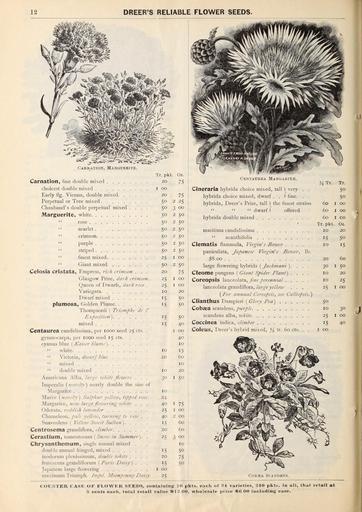 Keywords: Dreer's wholesale price list (16166214583).jpg 12 <br> DREER'S RELIABLE FLOWER SEEDS <br> CAKftATION MARODEBITE <br> Tr pkt Oz <br> Carnation fine double mixed 20 75 <br> choicest double mixed 1 00 <br> Early flg Vienna double mixed 20 75 <br> Perpetual or Tree mixed 50 2 25 <br> Chaubaud s double perpetual mixed 50 3 00 <br> Marguerite white 50 2 50 <br> rose 50 2 50 <br> scarlet 50 2 50 <br> crimson 50 2 50 <br> purple 50 2 50 <br> striped 50 2 50 <br> finest mixed 25 I 00 <br> Giant mixed 50 2 50 <br> Celosia cristata Empress rich crimson 20 75 <br> Glasgow Prize dark crimson 25 I 00 <br> Queen of Dwarfs dark rose 25 I 00 <br> Variegata 10 20 <br> Dwarf mixed 15 50 <br> piumosa Golden Plume 15 50 <br> Thompsonii Triomphe de P <br> Exposi/ion 15 50 <br> mixed 15 40 <br> Centaurea candidissima per 1000 seed 25 cts 1 00 <br> gymnocarpa per 1000 seed 15 cts 40 <br> cyanus blue K aiscr bhi ie 10 <br> white 10 15 <br> Victoria dwarf blue 20 60 <br> mixed 10 <br> double mixed 10 20 <br> Americana Alba hirgc wliile flowers 30 I 50 <br> Imperalis nove/ty nearly double the size of <br> Margaritae 10 <br> Mariae novel/y Sulphur yellow tipped rose 24 <br> Margaritae new large Jlo7uering 7vhite 40 I 75 <br> Odorata reddish lavender 25 I 00 <br> Chameleon pale yelhnu turning to rose 40 2 00 <br> Suaveolens Yelloit' S-weet Sultati 15 60 <br> Centrosema grandiflora climber 20 60 <br> QQr stium iomenlosnm Sno7u in Stimmer 25 3 00 <br> Chrysanthemum single annual mixed 10 <br> double annual fringed mixed 15 5° <br> inodorum plenissimum double white 20 75 <br> frulescens grandiflorum /Vjm Z'azV ' 15 50 <br> Japanese large flowering I 00 <br> maximum Triumph Impd Moonpenny Daisy 25 <br> Centaurea Makgarim <br> Tr Tr <br> Cineraria hybrida choice mixed tall 1 very 50 <br> hybrida choice mixed dwarf / fine 50 <br> hybrida Dreer's Prize tall the finest strains 60 I 00 <br> dwarf/ offered 60 i 00 <br> hybrida double inixed 60 I co <br> Tr pkt Oz <br> maritima candidissima 10 20 <br> acanthifolia 15 50 <br> Clematis fiammula Virgin s Bower 10 15 <br> paniculata Japanese Virgin s Bo-uer lb <br> 8 00 20 60 <br> large flowering hybrids yac/Jwawz 30 I 50 <br> Cl ome pvmgms Giant Spider Plant 10 20 <br> Coreopsis \dLncw\2Lla Jine perennial 10 25 <br> lanceolata grandiflora large yellow 25 I 00 <br> For annual Coreopsis see Calliopsis <br> CW nthus T amY \en Glory Pea 50 <br> Cobeea scandens purple 10 30 <br> scandens alba white 25 I 00 <br> Coccinea indica climber 15 40 <br> Coleus Dreer's hybrid mixed 14 tr 60 cts I 00 <br> COBJEA SCANDKN <br> COUNTER CASK OF FI OWK K SKKD S containing; lo pkts each ol 24 varieties 240 kt in all fliut retail at <br> 5 cents each total retail value Slli OO wholesale price 00 including case 45213627 161077 84662 Page 12 Text Winter Edition http //www biodiversitylibrary org/page/45213627 1899 Dreer Henry A Firm Biodiversity Heritage Library Dreer's wholesale price list / Garden Stories Bulbs Plants Catalogs Dreer Henry A Firm Nurseries Horticulture Nursery stock Pennsylvania Philadelphia Seed industry and trade Seeds Mertz Library The New York Botanical Garden bhl page 45213627 dc identifier http //biodiversitylibrary org/page/45213627 bhlGardenStories Flowers Carnation Centaurea Margarite BHLinbloom bulbs plants dreer henry a firm nurseries horticulture mertz library the new york botanical garden bhlgardenstories centaurea margarite bhlinbloom Information field Flickr posted date ISOdate 2015-03-11 CC-BY-2 0 BioDivLibrary https //flickr com/photos/61021753 N02/16166214583 2015-08-24 21 55 18 cc-by-2 0 PD-old-70-1923 1899 catalogs Dreer's wholesale price list Photos uploaded from Flickr by Fæ using a script |