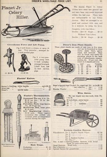 | Keywords: Dreer's wholesale price list (16785012461).jpg DREER'S WHOLESALE PRICE LIST <br> 31 <br> Planet Jr <br> Celery <br> Hiller <br> The famous Planet Jr Celery <br> llillers have come into general use <br> and have been very much improved <br> within the last year These tools <br> are indispensable to any Celery <br> Grower They are arranged to ex- <br> pand and contract with ease and <br> in a moment by using the lever <br> Complete with vine lifters <br> Double 10 50 Single 9 00 <br> Without Vine Lifters <br> Double 9 50 Single 8 00 <br> Greenhouse Force and Lift Pump <br> Fig 0 will throw a stream or spray 40 <br> feet Very powerful ; arranged for <br> 1-inch suction pipe <br> Fig 2 A very pow- <br> erful pump with <br> 2 - inch cylinder <br> arranged to attach <br> f-inch hose has <br> 1 i - inch suction <br> pipe <br> 0 5 50 <br> 2 7 00 <br> Florists' Knives <br> Saynoi's Budding white handle each 1 00 <br> American 70 <br> Dreer's special make 50 <br> Florist's Thermo meters- <br> Japanned Tin case 8 in 15c <br> 1 50 per doz ; 10 in 20c <br> 2 00 per doz <br> Porcelain Face large figures <br> 75c 8 50 per doz <br> Mushroom Bed brass point <br> 1 50 each <br> Self Registering Hick's <br> 2 50 each These register <br> accurately the coldest also <br> warmest point of temperature <br> reached during the night <br> Self Rbgistkring <br> Thebmomktkr <br> Pkrfection Olmstead's <br> Mole Traps <br> Perfection 1 85 <br> Olmstead's 1 40 <br> Dreer's Iron Plant Stands <br> These plant stands are made of cast iron in five sizes <br> and can be furnished in three <br> styles plain black galva- <br> nized and bronzed They <br> will he found very useful for <br> elevating plants in the back <br> rows of greenhouses conserv- <br> atories etc 10 per cent dis- <br> count on 5 stands and over <br> No <br> Inches <br> high <br> Plain <br> GalvaniEed <br> or Bronzed <br> 1 <br> 15 <br> 45 cts <br> 55 cts <br> 2 <br> 18 <br> 55 <br> 70 <br> 3 <br> 24 <br> 75 <br> 1 00 <br> 4 <br> 30 <br> 80 <br> 1 15 <br> 5 <br> 36 <br> 90 <br> 1 40 <br> Dreer's Special Steel Trowel 6 io stamped each 25c per doz ž 2 50 <br> heavy welded 6 in 50c 5 00 <br> Eureka Weeder 25c 2 50 <br> Wire Sieves <br> ® supply any size mesh om No <br> ' 1 30 <br> TSfik 20 inch diam extra heavy 65 <br> 18 50 <br> IIIIIUII 20 medium 45 <br> 18 40 <br> Ea steru Garden Barrow <br> Wheelbarrow No 2 Jacob's Patent Wheel 3 00 <br> No 3 3 50 <br> No 4 4 00 <br> No 4 Eastern Garden 3 50 <br> No 5 ; t 4 00 <br> Nos 4 and 5 Eastern Garden Barrows with broad <br> tread 25 cents extra each <br> Canal Barrows Wood body 2 00 <br> Boy's Barrows 2 00 <br> Special Narrow for greenhouse 3 00 45213608 161077 84662 Page 31 Text http //www biodiversitylibrary org/page/45213608 1898 Dreer Henry A Firm Biodiversity Heritage Library Dreer's wholesale price list / Garden Stories Catalogs Dreer Henry A Firm Nurseries Horticulture Nursery stock Pennsylvania Philadelphia Seed industry and trade Seeds Mertz Library The New York Botanical Garden bhl page 45213608 dc identifier http //biodiversitylibrary org/page/45213608 bhlGardenStories Garden Tools and Implements BHLinbloom dreer henry a firm nurseries horticulture mertz library the new york botanical garden bhlgardenstories garden tools and implements bhlinbloom Information field Flickr posted date ISOdate 2015-03-11 CC-BY-2 0 BioDivLibrary https //flickr com/photos/61021753 N02/16785012461 2015-08-24 21 54 53 cc-by-2 0 PD-old-70-1923 Dreer's wholesale price list Photos uploaded from Flickr by Fæ using a script |