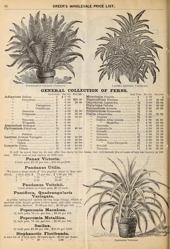 Keywords: Dreer's wholesale price list (16786143175).jpg 26 <br> DREER'S WHOLESALE PRICE LIST <br> Nephkolepis Cordata Comfacta <br> Lastrea Aristata Varieoata <br> GENERAL COLLECTION OF FERNS <br> Per 100 <br> 6 00 <br> 3 00 <br> 6 00 <br> 6 00 <br> 6 00 <br> 4 00 <br> 3 00 <br> 5 00 <br> 6 00 <br> 6 00 <br> 8 00 <br> 5 00 <br> 6 00 <br> 6 00 <br> 6 00 <br> 4 00 <br> 5 00 <br> 5 00 <br> 5 00 <br> Per 1000 <br> 25 00 <br> 50 00 <br> 35 00 <br> 25 00 <br> 40 00 <br> 40 00 <br> 50 00 <br> 35 00 <br> 40 00 <br> 40 00 <br> 40 00 <br> Inch Pots <br> Adiantum Bellum 2 <br> Cuufatum 2 <br> 3 <br> Variegatiim 2 <br> Grandiceps 2 <br> Decorum 2 <br> Pubescens 2 <br> 3 <br> Tenerum 2 <br> Wiegandi 2 <br> Asplenium Belangeri 2 <br> Cyrtomium Falcatum 2\ <br> 3 <br> Fortuni 2 <br> Lastrea Aristata Variegata 2 <br> ' ' Lepidota 2 <br> Opaca 2 <br> Lomaria Gibba 2 <br> Ciliata 2i <br> It will be noted that we do not offer the above by the <br> rate 250 or over of one variety at 1000 rate <br> Panax Victoria <br> 3 inch pots 1 25 per doz ; 10 00 per 100 <br> Pandanns Utilis <br> We have a large stock of this popular plant iu'fiue con- <br> dition 2 inch pots 75 per doz 6 00 per 100 <br> 3 1 25 10 00 <br> 4 2 50 20 00 <br> Pandauns Veitchii <br> Good plants in 6 inch pots 1 25 each <br> Passiflora Quadrangularis <br> Variegata <br> A pretty varie ;ated variety having large foliage which is <br> mottled with bright golden yellow spots and light colored <br> almost white flowers 1 00 per doz ; 8 00 per 100 <br> Peperomia Maculosa <br> 2 inch pots 75 cts per doz ; 6 00 per 100 <br> Peperomia Metallica <br> 2 inch pots 75 cts per doz ; 6 00 per 100 <br> Smilax <br> 2 inch pots 3 50 per 100 ; 30 00 per 1000 <br> Steplianotis Floribnnda <br> A nice lot of 2 inch pots 20 cents each ; 2 00 per dozen <br> 3 30 3 00 <br> Per 100 <br> Inch Pots <br> Microlepia Hispida 2 <br> Nephrodium Hertipes 2 <br> Onychium Japonicnm 2i <br> Platyloma Falcata 2 <br> Polypodium Aureum 2 <br> Polystichum Coreaceum 2 <br> Pteris Adiantoides 2 <br> Argyrea 2j <br> Cretica Alba Lineata 2 <br> Magnifica 2 <br> Internata 2 <br> Leptophylla 2 <br> Ourardi 2 <br> Palmata 2i <br> Serrulata 2 <br> Cristata 2 <br> Nana Campacta 2 J <br> Sieboldi 2\ <br> Tremula 2 <br> dozen but will furnish five or more of any one variety at 100 <br> 00 <br> 00 <br> 00 <br> 00 <br> 00 <br> 00 <br> 00 <br> 00 <br> 00 <br> 00 <br> 00 <br> 00 <br> 00 <br> 00 <br> 00 <br> 50 <br> 00 <br> 00 <br> 00 <br> Per 1000 <br> 4 <br> 40 00 <br> 25 00 <br> 40 00 <br> 40 00 <br> 25 00 <br> 35 00 <br> 35 00 <br> 35 00 <br> 35 00 <br> 35 00 <br> 35 00 <br> 25 00 <br> 30 00 <br> 35 00 <br> 35 00 <br> 35 00 <br> Pandanus Veitchii 45213565 161077 84662 Page 26 Text Summer Edition http //www biodiversitylibrary org/page/45213565 1898 Dreer Henry A Firm Biodiversity Heritage Library Dreer's wholesale price list / Garden Stories Bulbs Plants Catalogs Dreer Henry A Firm Nurseries Horticulture Nursery stock Pennsylvania Philadelphia Seed industry and trade Seeds Mertz Library The New York Botanical Garden bhl page 45213565 dc identifier http //biodiversitylibrary org/page/45213565 bhlGardenStories Flowers Ferns Pandanus Veitchii BHLinbloom bulbs plants dreer henry a firm nurseries horticulture mertz library the new york botanical garden bhlgardenstories pandanus veitchii bhlinbloom Information field Flickr posted date ISOdate 2015-03-11 CC-BY-2 0 BioDivLibrary https //flickr com/photos/61021753 N02/16786143175 2015-08-24 21 52 16 cc-by-2 0 PD-old-70-1923 Dreer's wholesale price list Photos uploaded from Flickr by Fæ using a script |