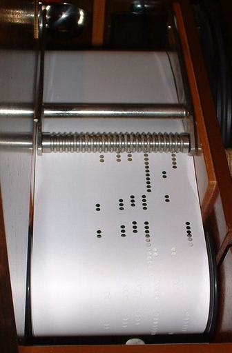 | Keywords: DrehorgelLochkarte.jpg Description Music roll of a barrel organ in place inside the organ Each hole across the roll marks the position of a note As the roll passes over the note valves each hole allows air to pass through and sound one of the organ pipes Source photographed --Immanuel Giel 12 53 6 Jun 2005 UTC Barrel organs Music rolls Sequence controllers Punched tapes |