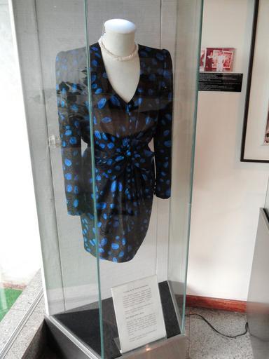 Keywords: Dress of Mrs Sarah Kubitschek - Memorial JK - Brasilia - DSC00397.JPG IExhibit in the Memorial JK Brasília Brazil Daderot 2012-05-30 07 51 50 Daderot cc0 cc0 Exhibits in the Memorial JK Black and blue clothing Black dresses Blue dresses