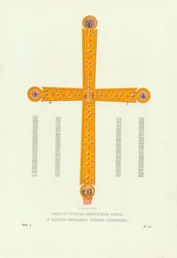 | Keywords: Drevnosti RG v1 ill029 - Korsynsky krest.jpg ru Д евности Российского госуда ства Antiquities of Russian country 1846 1853 Т 1 Иллюст ато Солнцев Фёдо Г иго ьевич Ста инные Ко сунские к есты и звездица Антония Римлянина Ко сунскими к естами называются зап естольные т и к еста в алта е московского Успенского собо а Один из них четы ехконечный обитый позолоченными се еб яными листами; лицевая сто она усеяна самоцветными каменьями и клеймами с об онными изоб ажениями азных святых а се едине и по концам в к угах наведены финифтью Распятие Деисус Благовещение и Воск есение а об атной сто оне поле ук ашено звездами из х усталей; на се едине и на концах в клеймах чеканные изоб ажения господских п аздников В пе еписных книгах московского Успенского собо а ск епленных в 1627 г Симоновским а химанд итом Иосифом впоследствии пат иа хом об этом памятнике благочестия сказано «За п естолом же к ест большой Ко сунский обложен се еб ом в пяти местех писаны господские п аздники мусиею на золотых цках; в нем же в гнездех сто семь х усталей» Д угие два к еста четы ехконечные из го ного х усталя ск епленные се еб ом; они утве ждены на д евках для ношения в к естных ходах а этих священных памятниках нет надписей кои бы свидетельствовали нам об их местности и д евности но п едание гласит что они пе енесены п осветителем России Владими ом I в столичный г ад Киев из поко енной им Ко суни оттуда пе ешли во Владими и потом в оскву О пе вом к есте свидетельствует книга Жезл 1655 г что он «п ед агоценный окладом неоцененный об азом д евностью п ечестный именуемый Ко сунский алта ь Господень яко солнце п освещает в собо ном х аме в мате и всех це квей» В 1812 г святыни сии не были вывозимы из осквы 1846 1853 http //www runiverse ru/bookreader/book403605/ page/61/mode/1up Солнцев Фёдо Г иго ьевич PD-Art Antiquities of Russian country - Volume I Files uploaded by Shakko from various sources Uploaded with UploadWizard Korsun cross Objects of Assumption Cathedral in Moscow |