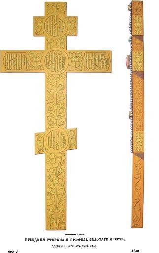 | Keywords: Drevnosti RG v1 ill031.jpg ru Д евности Российского госуда ства Antiquities of Russian country 1846 1853 Т 1 Иллюст ато Солнцев Фёдо Г иго ьевич Золотой к ест сделанный п и ца е Иоанне Васильевиче IV в 1560 г х анится в московском А хангельском собо е Сей к ест в московском А хангельском собо е из чеканного вызолоченного се еб а с литыми из того же металла накладными аспятием и об азами Богомате и Иоанна Богослова и д угих святых; длиной он 2 четве ти 1/4 ве шка по местам ук ашен к упным угловатым жемчугом и д агоценными каменьями а подножии его следующая надпись означает вкладчика в емя и место соо ужения Въ лето /--зs /--афk Ап еля въ ка день повелЊнїемъ Благове наго Ца я Ивана Васильевича всеа Русїи здЊланъ сїй к естъ в к`з лето госуда ства его к п еименїтый х амъ и собо ъ А хїст атїга ихаила въ Богоспасаемомъ г аде оскве а обо отной сто оне к еста д угая надпись вязью узловатая в нескольких к ужках как сказано в ста инной описи собо ной изницы изоб ажена большими ф яжскими буквами; она соде жит в себе имена тех святых коих мощи вложены в этот к ест Славянские буквы названы ф яжскими по их поче ку или пошибу известному также под именем «ф яжской азбуки» кото ая состояла из связанных между собой узловатых букв и упот еблялась в надписях и в к асных ст оках Поскольку д агоценные св утва и большей частью уст аиваемы были госуда ями по обещанию и в ознаменование счастливых событий то ве оятно и сей к ест сделан ца ем Иоанном Васильевичем в возблагода ение Богу за победы его в Ливонии где в 1560 г усские взяли 11 го одов и за успехи о ужия его в К ыму Д угой к ест нап естольный в изнице А хангельского собо а золотой чеканный почти одинаковой величины с пе вым; он ук ашен д агоценными камнями и к упным жемчугом Работа его отличается чистотой Из надписи на нем видно что он пожалован в собо ца ем Федо ом Алексеевичем в 1677 г на вечное поминовение одителя своего 1846 1853 http //www runiverse ru/bookreader/book403605/ page/61/mode/1up Солнцев Фёдо Г иго ьевич PD-Art Antiquities of Russian country - Volume I Files uploaded by Shakko from various sources Uploaded with UploadWizard Objects of Cathedral of the Archangel in Moscow Ivan IV of Russia's items Donations of Russian rulers to Church Altar crucifixes in Russia 1560 works in Russia |