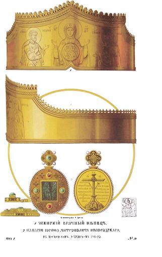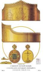 | Keywords: Drevnosti RG v1 ill037.jpg ru Д евности Российского госуда ства Antiquities of Russian country 1846 1853 Т 1 Иллюст ато Солнцев Фёдо Г иго ьевич A женский б ачный венец Б панагия Иосифа ит ополита Вологодского х анятся в московском Успенском собо е В изнице московского Успенского собо а сох анились д евние се еб яные с позолотой б ачные венцы мужской и женский какие п и венчании возлагались на ца ей и ца иц Они уст оены в виде об уча выдавшегося на челе ко онкой с го одками по к аям; на одном из них вы езан Деисус а на д угом Знамение Бого одицы Богоотцы Иоаким и Анна Судя по стилю аботы венцы сии п инадлежат XVII в ; фигу ой своей сходствуют с д евними из се еб а меди железа и де ева какие упот еблялись п и венчании Венец вообще как символ вечности в особенности венец б ачный как знак таинственного союза наг ады за целомуд ие и благословений небесных известен был у иудеев что видно из слов Исайи П о ока LXI 10 «яко на жениха возложи венец» В Песни Песней III 11 божественный жених п едставляется в венце «имже венча его мати его и в день об учения его и в день веселия се дца его» Восточная п авославная це ковь ввела в упот ебление п и б акосочетании венцы означавшие по толкованию св Иоанна Златоуста «победу над соблазнами и сочетание двух в плоть едину» От них и самое б акосочетание называется венчанием т е благословением це ковным кото ое п еподается новоневестным с возложением на главы их венцов Венчанию п едшествовало об учение пе стнями как п иготовительная часть б ака в знамение «об учения Господу Богу це кви честной»; пе стень у мужа был золотой у жены железный или се еб яный как знак п еимущества и владычества одного подчиненности и поко ности д угой В д евних т ебниках вст ечается еще чин пост игания сове шавшегося к естооб азно на главе венчаемых пе ед возложением венцов дотоле лежавших в алта е на п естоле После венчания в ектении новоб ачные на екались князем и княгиней ожет статься сии названия даны им оттого что в пе вые века х истианства на Руси венчались только князья и боя е; ибо сов еменник есто а Иаков-че но изец п едставлял мит ополиту Иоанну что «не бывает на п остых людях благословение венчания но боя е токмо и Князья венчаются» В п одолжение семи дней венцы с новоб ачных не снимались; на восьмой день было аз ешение венцов Сей чин це ковный сове шался с молитвой положенной в «Т ебнике» возблагода ение Богу за соблюдение новоб ачных в целомуд ии Впоследствии эти об яды сок ащены и венцам б ачным дана фо ма ко оны а эстампе под 36 вместе с б ачным венцом изоб ажена святительская панагия золотая; на лицевой сто оне ее вставлен д евний камей п едставляющий п о ока Даниила спцЮфзт ДбнйЮл с двумя львами п и подножии; вок уг камея четы е самоцветные камня в гнездах азмещенные к естооб азно а об атной сто оне вы езан к ест на Голгофе с венцом на междук естии с копием и т остью; на полях следующая надпись «в сей иконе мощи святаго Апостола Анд ея Пе возваннаго и святаго Апостола Ва навы святаго великомученика Гео гия святаго мученика Анфеногена да мощи Ца я Константина» Хотя в надписи на эстампе и означено что панагия сия п инадлежала «Иосифу ит ополиту Вологодскому» но между ие а хами Вологодской епа хии не было мит ополитов а только епископы и а хиепископы в числе коих вст ечаются а хиепископ Иосиф I хи отонисания в 1708 г и Иосиф II хи отонисания в 1761 г По описи же собо ной панаг