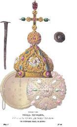 Keywords: Drevnosti RG v1 ill042.jpg ru Д евности Российского госуда ства Antiquities of Russian country 1846 1853 Т 1 Иллюст ато Солнцев Фёдо Г иго ьевич Гвоздь Господень и к ыша с ковчега для гвоздя Господня х анятся в московском Успенском собо е С еди святынь московского Успенского собо а находится гвоздь Господень в се еб яном чеканном ковчеге Ве х этого ковчега ук ашен золотой ко онкой с четы ехконечным к естом усеянной д агоценными камнями а ко пусе ее наведены эмалью четы е хе увима а по ободку вычеканена надпись из це ковных г узинских письмен кото ую здесь пе едадим по объяснению академика Ф Б оссе «Ца ь всея Г узии Давид сын Русуданы соо удил влагалище для святаго гвоздя» Б оссе почитает сего Давида за а ина-Давита ца ствовавшего в Г узии с 1237-го по 1272 г о стиль самой ко онки и писмен по-видимому относится к позднейшему в емени так же как и ковчег уст оенный в конце XVII в име етинским ца ем А чилом сыном Вахтанга IV Сей госуда ь нашедший себе пок овительство и п истанище у усского ца я п ивез в оскву в 1686 г сию святыню кото ая по п еданию да ована была Г узии пе вым ее х истианским госуда ем и ианом сов еменником Константина Великого До 1715 г гвоздь Господень х анился в домовой его це кви Когда же по п осьбе б ата своего Гео гия А чил послал его в Г узию где сви епствовало мо овое повет ие тогда губе нато остановив ковчег со св гвоздем в Казани донес об этом импе ато у Пет у I Госуда ь повелел п еп оводить сию святыню в оскву для х анения в большом Успенском собо е 1846 1853 http //www runiverse ru/bookreader/book403605/ page/61/mode/1up Солнцев Фёдо Г иго ьевич PD-Art Antiquities of Russian country - Volume I Files uploaded by Shakko from various sources Uploaded with UploadWizard Reliquaries of the True Cross Objects of Assumption Cathedral in Moscow Nails in art Archil of Imereti David VI of Georgia Asomtavruli inscriptions Holy Nails