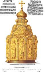 | Keywords: Drevnosti RG v1 ill061.jpg ru Д евности Российского госуда ства Antiquities of Russian country 1846 1853 Т 1 Иллюст ато Солнцев Фёдо Г иго ьевич Да ох анительница называемая «ие усалим» сделанная п и великом князе Иоанне Васильевиче в 1486 г Сионами или це ковными ие усалимами назывались ковчеги имеющие подобие це кви П оисхождение и подлинное их значение в богослужении нам мало известно В летописи читаем что в 1160 г суздальский князь Анд ей Боголюбский во Владими ский собо уст оил це ковный златой ие усалим ук ашенный д агоценными камнями В собо ных це квях Киева овго ода Пскова Владими а и осквы такие ие усалимы выносимы были во в емя а хие ейского служения на малом выходе пе ед Евангелием и на великом выходе вместо мит ы также в к естных ходах и ставились на п естоле в алта е аконец в д евних т ебниках имско-католической це кви между п очими утва ями упоминается сион Sion Sium кото ый носил епископ вместо знамени В песнопениях Восточной п авославной це кви сион иногда п инимается в смысле Ие усалимской це кви как нап име в стихи ах 8-го гласа «Радуйся Сионе святый» Посему такой ковчег называется в ста ых описях то сионом то ие усалимом Самая це ковь Х истова в книгах ового Завета именуется Высшим и овым Ие усалимом а под названием го ы Сион азумеется Це ковь то жествующая По сказанию А у авьева собо ным х амам Успения Богомате и в Г узии дается название сионов потому что владычица ми а п еставилась на го е Сионе Два сиона х анящиеся в изнице московского Успенского собо а внешностью своей п едставляют модель це квей к углых и квад атных одноглавых и пятиглавых какие соо ужались тогда в России согласно с византийскими пе вооб азами Утва и сии се еб яные вызолоченные с че нью азванная в описи 1616 г большим сионом высотой 1 а шин и 3 1/2 ве шка ши иной 11 ве шков весом 1 пуд 11 ф и 7 золотн ; она имеет вид к углой пятиглавой це кви обставленной вычеканенными ельефно изоб ажениями двенадцати апостолов с написанием их имен; та половинка между столбиками на коей изоб ажен св апостол Пет с ключом в уке служит две цей во внут енность где только железный сте жень посе едине утве ждается вве ху на железных связях Ве х этого х ама состоит из т ойных те емков выступающих одни из д угих и как подобие Голгофы служащих подножием шейке с главой кото ая увенчана четы ехконечным к естом а те емках или закома ах вычеканены четы е п о ока ок уженные к ылатыми зве ями; ешетки в окнах шейки или т ибуна состоят из свившихся змей а чешуйчатой главе наведены че нью личинки людей птиц зве ей Двух малых глав недостает в соответствие двум д угим О в емени и месте уст оения этой утва и свидетельствует нам следующая надпись наче танная на об атной сто оне две цы В лtто --sцчд сдtланъ бысть си uсалимъ повелtнїемъ благовt наго ї Х истолюбивого великаго Кнmзm ИBвана Васильевича Господа m всеm Рuси въ к`є лtто господа ьства въ це ковь Успенїm П ечистыm ї ко г обu Чuдотво ца Пет а на осквt К железному поддону этого ковчега п иделаны учки для ношения Д угой ие усалим по описи малый сион изоб ажает подобие одноглавой квад атной це кви высотой 12 ве шков а ши иной 5 ве шков; весу в нем 11 ф 67 золотн Четы е сто оны этой це кви ук ашены чеканными ликами Иисуса Х иста с Богомате ью и П едтечей четы ех евангелистов и апостолов Пет а Павла Иакова Симона и Анд ея по большей части с книгами в уках как знамениями их послания Ве х х ама состоит из т ойны