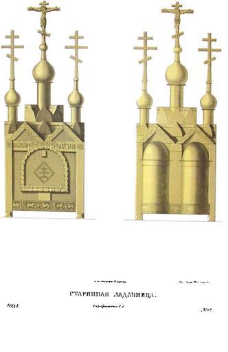 | Keywords: Drevnosti RG v1 ill063.jpg ru Д евности Российского госуда ства Antiquities of Russian country 1846 1853 Т 1 Иллюст ато Солнцев Фёдо Г иго ьевич Ста инная ладанница едное ладанох анилище сие подобно д угим ладанницам и св утва ям п едставляет пятиглавую це ковь увенчанную восьмиконечными к естами; на одном из них литое аспятие а нижней ее части в узо очной кайме изоб ажены левики; с двух сто он ка низ заменен следующей надписью снятой нами с исунка г Солнцева П еwб аженїm Гд`а Бг`а иb Спаса нашего Icи`са Х `ста въ Ста ицкой собо ъ въ монасты t їнокъ Fеwгностъ Icwсифова монасты m В собо ном служении такая ладанница подобно сионам или ие усалимам выносима была на малом и великом выходах 1846 1853 http //www runiverse ru/bookreader/book403605/ page/61/mode/1up Солнцев Фёдо Г иго ьевич PD-Art Antiquities of Russian country - Volume I Tabernacles from Russia Files uploaded by Shakko from various sources Uploaded with UploadWizard |