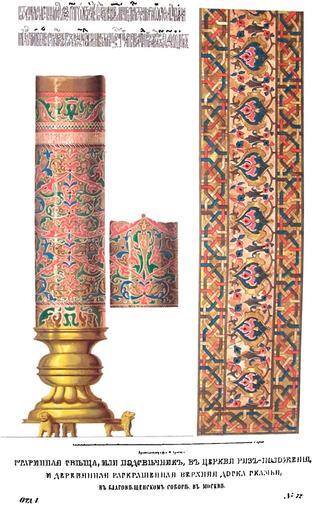 | Keywords: Drevnosti RG v1 ill073.jpg ru Д евности Российского госуда ства Antiquities of Russian country 1846 1853 Т 1 Иллюст ато Солнцев Фёдо Г иго ьевич Ста инная свеча или подсвечник в це кви Ризположения и де евянная аск ашенная ве хняя доска скамьи в Благовещенском собо е в оскве В Ризположенской це кви осковского К емля пе ед местными об азами стоят четы е вощаницы или тощие асписные свечи на медных поддонах с т емя левиками Они состоят из де евянного столба высотой в 5 четве тей обложенного воском по коему наведены мозаично восковыми к асками т авы и цветы в оде энкаустики известной г екам и имлянам Т и вощаницы сох анены в пе воначальном своем виде а четве тая после 1812 г возобновлена по об азцу пе вых Све ху над ними утве ждены медные шандалы каких п ежде не было ибо свечи вставлялись в се едину вощаницы По к айнему ободу идет вязью надпись кото ая показывает нам в емя уст оения сих узо очных свеч в пат иа шество Иосифа п авительствовавшего с 1642-го по 1652 г вместе с тем свидетельствует о существовании тогда п и этой це кви Пат иа шего дво а Пе едаем надписи с двух свеч к оме т етьей где слова большей частью изгладились или обломались и к оме четве той на коей вновь изоб ажены они согласно с пе выми 1 Лtта /--з `на поставлена сїm свtща п едъ об азомъ П есвmтыm Бого одицы Ризъ Положенїm повеленїемъ Великаго Господина Свmтtйшаго IBосифа Пат їа ха осковскаго и всеm Рuсиї въ це кви Ризположенїm что на Пат їа шемъ дво t 2 Лtта /-- з `нг Октmб m въ є` день повtленїемъ Великого Господина Свmтtйшаго IBоси`fа Пат їа ха осковского иb всеа Рuсиї въ це квt П ечистые Бого одицы Ризположенїе что на ево Госuда m Пат їа ше дво t п едъ мtстой об азъ П есвmтые Бого одицы Одегит їе поставлена сїа свtща П едставляя здесь памятник це ковного благолепия из XVII в нельзя оставить без замечания что п ежде не в одной Ризположенской пат иа шей це кви но и в собо ах и це квях к оме подсвечников и лампад находились такие вощаницы у об азов на поклоне в алта ном иконостасе и назывались поставными тощими местными а выносные свечи ослопными Подобно как у г еков п авославных у усских не едко бывали вощаницы и лампады обетными и неугасимыми кои го ели п ед об азами или св мощами день и ночь; в се едине их вкладывалась свеча кото ую и зажигали Такие вощаницы ставили великие князья п ед чудотво ными иконами и аками угодников Божьих также и п ед г обами одительскими Иногда всем овго одом и Псковом соо ужаема была по обещанию неугасимая свеча в Софийский или Т оицкий собо ы Так великий князь Василий в 1509 г уст оил п ед Св Т оицей в Псков и п ед Софией П емуд остью Божией свещи неугасимые2 Ца ь Иоанн IV в 1569 г п ислал в овго од к мощам св икиты епископа овго одского местную свечу кото ая поставлена была на каменном белом стуле Летописи наши не едко упоминают о чудесном самовозго ании свечей в це квях Св Алексий ит ополит взял с собой в О ду для исцеления Тайдулы свечу от вощаницы затеплившейся в Успенском собо е Пе ед г обами отеческими великие и удельные князья ставили неугасимые свечи с тем как они огова иваются в духовных своих г амотах чтобы «не пе естала память одителей и свеча бы их не угасла» Загасить свечу над г обом по объяснению А цыбашева значило то же что шевелить костями о также после отпевания загасить и положить свечу на г об усопшего знаменовало вечное забвение всякой в ажды Ближайший п име тому вст ечаем в овом Ие усалиме где п и пе 