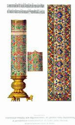 | Keywords: Drevnosti RG v1 ill073a - Russian Candle.jpg ru Д евности Российского госуда ства Antiquities of Russian country 1846 1853 Т 1 Иллюст ато Солнцев Фёдо Г иго ьевич Ста инная свеча или подсвечник в це кви Ризположения и де евянная аск ашенная ве хняя доска скамьи в Благовещенском собо е в оскве В Ризположенской це кви осковского К емля пе ед местными об азами стоят четы е вощаницы или тощие асписные свечи на медных поддонах с т емя левиками Они состоят из де евянного столба высотой в 5 четве тей обложенного воском по коему наведены мозаично восковыми к асками т авы и цветы в оде энкаустики известной г екам и имлянам Т и вощаницы сох анены в пе воначальном своем виде а четве тая после 1812 г возобновлена по об азцу пе вых Све ху над ними утве ждены медные шандалы каких п ежде не было ибо свечи вставлялись в се едину вощаницы По к айнему ободу идет вязью надпись кото ая показывает нам в емя уст оения сих узо очных свеч в пат иа шество Иосифа п авительствовавшего с 1642-го по 1652 г вместе с тем свидетельствует о существовании тогда п и этой це кви Пат иа шего дво а Пе едаем надписи с двух свеч к оме т етьей где слова большей частью изгладились или обломались и к оме четве той на коей вновь изоб ажены они согласно с пе выми 1 Лtта /--з `на поставлена сїm свtща п едъ об азомъ П есвmтыm Бого одицы Ризъ Положенїm повеленїемъ Великаго Господина Свmтtйшаго IBосифа Пат їа ха осковскаго и всеm Рuсиї въ це кви Ризположенїm что на Пат їа шемъ дво t 2 Лtта /-- з `нг Октmб m въ є` день повtленїемъ Великого Господина Свmтtйшаго IBоси`fа Пат їа ха осковского иb всеа Рuсиї въ це квt П ечистые Бого одицы Ризположенїе что на ево Госuда m Пат їа ше дво t п едъ мtстой об азъ П есвmтые Бого одицы Одегит їе поставлена сїа свtща П едставляя здесь памятник це ковного благолепия из XVII в нельзя оставить без замечания что п ежде не в одной Ризположенской пат иа шей це кви но и в собо ах и це квях к оме подсвечников и лампад находились такие вощаницы у об азов на поклоне в алта ном иконостасе и назывались поставными тощими местными а выносные свечи ослопными Подобно как у г еков п авославных у усских не едко бывали вощаницы и лампады обетными и неугасимыми кои го ели п ед об азами или св мощами день и ночь; в се едине их вкладывалась свеча кото ую и зажигали Такие вощаницы ставили великие князья п ед чудотво ными иконами и аками угодников Божьих также и п ед г обами одительскими Иногда всем овго одом и Псковом соо ужаема была по обещанию неугасимая свеча в Софийский или Т оицкий собо ы Так великий князь Василий в 1509 г уст оил п ед Св Т оицей в Псков и п ед Софией П емуд остью Божией свещи неугасимые2 Ца ь Иоанн IV в 1569 г п ислал в овго од к мощам св икиты епископа овго одского местную свечу кото ая поставлена была на каменном белом стуле Летописи наши не едко упоминают о чудесном самовозго ании свечей в це квях Св Алексий ит ополит взял с собой в О ду для исцеления Тайдулы свечу от вощаницы затеплившейся в Успенском собо е Пе ед г обами отеческими великие и удельные князья ставили неугасимые свечи с тем как они огова иваются в духовных своих г амотах чтобы «не пе естала память одителей и свеча бы их не угасла» Загасить свечу над г обом по объяснению А цыбашева значило то же что шевелить костями о также после отпевания загасить и положить свечу на г об усопшего знаменовало вечное забвение всякой в ажды Ближайший п име тому вст ечаем в овом Ие усалиме 