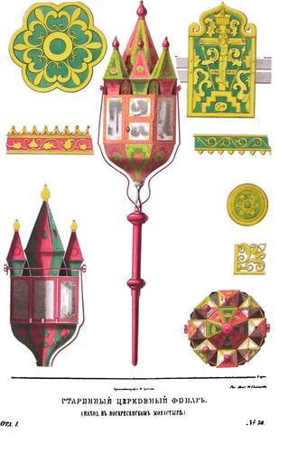 | Keywords: Drevnosti RG v1 ill075.jpg ru Д евности Российского госуда ства Antiquities of Russian country 1846 1853 Т 1 Иллюст ато Солнцев Фёдо Г иго ьевич Ста инный це ковный фона ь находится в Воск есенском монасты е Этот выносной фона ь п инадлежит Воск есенскому монасты ю что называется овый Ие усалим; он уст оен из де ева обложенного вычу ными о наментами из меди и бляшками из олова Ему дано подобие це кви с шат овыми ве хами у коих недостает только к естов Вместо стекол вставлена слюда; затейливость и к асивость в целом и частях свидетельствуют об искусстве и тщательности художника По-видимому этот выносной фона ь относится ко в емени основателя ового Ие усалима икона Пат иа ха Самое название как и утва ь заимствованы из об ядника византийской це кви потому что значит «светец фона ь» Такие це ковные фона и в к естных хождениях носили пе ед св иконами или пе ед св да ами когда их п еп овождали из це кви в дом к опасно больным Они изоб ажены на ста инных св иконах и вст ечаются в це ковных описях так нап име в описи московского Успенского собо а 1628 г «фона ь слюдень к углой» Из его устава видно что п и пат иа хах упот еблялись в к естных хождениях фона и большой с едний и малый Ог омный фона ь с двуглавым о лом доныне обыкновенно носят в к естных ходах московских 1846 1853 http //www runiverse ru/bookreader/book403605/ page/61/mode/1up Солнцев Фёдо Г иго ьевич PD-Art Antiquities of Russian country - Volume I Files uploaded by Shakko from various sources Uploaded with UploadWizard Orthodox cross processional lanterns New Jerusalem monastery in art |