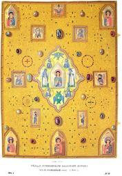 | Keywords: Drevnosti RG v1 ill078.jpg ru Д евности Российского госуда ства Antiquities of Russian country 1846 1853 Т 1 Иллюст ато Солнцев Фёдо Г иго ьевич Оклад укописного Евангелия XII в х анится в московском А хангельском собо е Славянское сие Евангелие в десть XII в ха акте ное по д евности своей вто ое после Ост оми ова списка составляет одно из палеог афических сок овищ московского А хангельского собо а Оно как значится в послесловии писано в 1125 г Алексою Лаза евым сыном п есвите а для новго одского князя стислава Владими овича внука Всеволода от коего дошла до нас г амота Ю ьеву монасты ю иниатю ы писанные ко пусными к асками во многом сходны с Ост оми овым списком Ост оми ово Евангелие как нап име по изоб ажению тельца с ха тией кото ый является евангелисту с высоты усеянной звездами и по надписи симъ об азомъ тельчемъ Дх`ъ Ст`ый явися Ляцt В послесловии сказано и возивъ Ц `ю го одu и оучинихъ химипетъ Последнее слово остававшееся до сих по неизъясненным весьма ве оятно п оисходит от г еч «п еклоняюсь до земли» и значит «поклонение» Рукопись эта д агоценная в палеог афическом отношении не менее важна и в художественном по своему окладу д евней может быть сов еменной ей аботы Доски Евангелия пок ыты с лица золотой сканью с двенадцатью мусийными клеймами на коих изоб ажены азные святые и с се едником на коем наведен мусией лик Спасителя ок уженного четы ьмя евангелистами двумя а хангелами и двумя се афимами Подписи г еческие и славянские Оклад уб ан д агоценными камнями и жемчугом Судя по его д евности и стилю можно п едполагать что списатель во в емя п ебывания своего в Константинополе ук асил т уд свой г еческим делом на иждивение князя стислава коего он называет своим ца ем Титул этот по замечанию Кеппена здесь вст ечается в пе вый аз п и имени князей кои иногда величаемы были «каганами» Известно что удельный князь стислав после 1125 г вступил на великокняжеский Киевский п естол или как он гово ит сам в г амоте своей «дь жа Роускоу землю в своие княжение» 1846 1853 http //www runiverse ru/bookreader/book403605/ page/61/mode/1up Солнцев Фёдо Г иго ьевич PD-Art Antiquities of Russian country - Volume I Files uploaded by Shakko from various sources Uploaded with UploadWizard Mstislavovo Gospel Gospel Books covers from Russia |