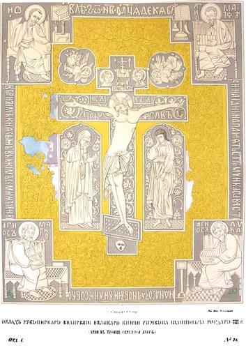 | Keywords: Drevnosti RG v1 ill079.jpg ru Д евности Российского госуда ства Antiquities of Russian country 1846 1853 Т 1 Иллюст ато Солнцев Фёдо Г иго ьевич Оклад укописного Евангелия великого князя Симеона Иоанновича Го дого 6852/1344 г <s> х анится в Т оице-Се гиевой лав е </s> РГБ ф 304 III 1 / 8653 Ха атейное пе гаментное Евангелие с Апостолом х анящееся в изнице Т оице-Се гиевой лав ы как памятник палеог афии и то евтики XIV в д агоценно пятивековой д евностью и достопамятно венценосным его вкладчиком сов еменником п еподобному Се гию Оно писано на пе гаменте в десть в два столбца четким уставом; дневные чтения из евангелистов и апостолов асположены по це ковному по ядку Доски его обложены басменным вызолоченным се еб ом на коем выбиты азные изоб ажения аспятого Иисуса Х иста Iи`с Х `съ Ц `ь Сл`вы Божией ате и Бм фм и Иоанна Богослова Fг`а иw` и евангелистов а окладе пе едней доски наведена че нью следующая надпись Въ лtто /--swнб мtсяца Декаб я осьмый надесять день на память ст`го муч`нк Савастїана создано бысть Еvаг`лье се благовt нымъ Княземъ Великимъ Сїмеономъ Iвановичемъ Слова сии указывают без сомнения на ук ашение Евангелия; укопись же могла быть и д евнее Подобные памятники благочестия почти всегда были в связи с какими-нибудь важными п оисшествиями Сын и п еемник Калиты Симеон возв атился из О ды 26 октяб я 1344 г «пожалованный Богом и Ца ем» П едполагают что это Евангелие уст оено Симеоном в благода ность Господу за благополучное сове шение опасного путешествия Такое сооб ажение может быть п авдоподобным но вместо 5508 лет от с м сотво ения ми а следовало бы вычитать 5509 лет ибо месяц соо ужения был декаб ь В таком случае выйдет 1343 г когда великий князь Симеон с мит ополитом Феогностом ездил в О ду к хану Джанибеку В 1346-м или 1347 г Симеон по п изыву новго одского владыки Василия и по благословению мит ополита Феогноста «седе на столе своем» в Великом овго оде Вско е появился в земле усской «мо зол» известный под именем «че ной сме ти» от коей суждено кончить жизнь великому князю в 1353 г Такие события важные в госуда ственной жизни давали повод к соо ужению це квей и св утва ей как благода ственных или умилостивительных же тв Тогда Се гий подвизался в пустынном уединении а б ат его Стефан был игуменом московского Богоявленского монасты я и духовником великого князя Симеона Иоанновича Из чего следует что уст оение этого нап естольного Евангелия в оскве сов еменно основанию Т оице-Се гиевой обители о так как из надписи не видно чтобы оно п едназначено было для сей обители то может статься после дано вкладом на поминовение соо удителя и ск ыто было во в емя нашествия Эдигея п едавшего огню Т оицкий монасты ь в 1408 г 1846 1853 http //www runiverse ru/bookreader/book403605/ page/61/mode/1up Солнцев Фёдо Г иго ьевич PD-Art Antiquities of Russian country - Volume I Gospel Books covers from Russia Files uploaded by Shakko from various sources Uploaded with UploadWizard Simeon of Moscow Manuscripts in Russian State Library |