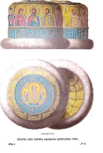 | Keywords: Drevnosti RG v1 ill086.jpg ru Д евности Российского госуда ства Antiquities of Russian country 1846 1853 Т 1 Иллюст ато Солнцев Фёдо Г иго ьевич В московской Пат иа шей изнице мит ы пе вого и шестого пат иа хов Все оссийских Иова и икона напоминая нам лица замечательные в исто ии ие а хии и госуда ства и отчасти сходные своим ж ебием в то же в емя об ащают внимание на п оисхождение пе воначальное знаменование и введение сего главного ие а хического отличия ит а есть слово г еческое означающее головную повязку увясло наглавие кида Так как она составляла отличительное ук ашение вообще иудейских пе восвященников а со в емени Давида и ца ей то в под ажание пе вым а хипасты и х истианской це кви усвоили себе подобное наглавие У пе восвященников на златой дщице ук ашавшей чело кида а изоб ажены были слова святыня Господня замененные на мит е а хие ейской ликами Спасителя Богомате и и д угих святых В век Иисуса Х иста по свидетельству Иосифа Флавия ж ецы из племени маккавеев бывшие вместе и ца ями к мит е п исоединили т ойную ко ону Итак по пе воначальному п оисхождению мит а составляла главную утва ь ца ей и пе восвященников как символ помазания и власти Це ковь х истианская не едко об ащающая внешнее вещественное в символы духовного сообщила мит е высокое значение славы Господа и власти данной от него служителям святилища посему-то Евсевий называет ее венцем славы Вселенский святитель Иоанн Златоуст в похвале Евангелию внушает укополагаемому епископу что «п инятие венца знаменует Евангелие что хотя он всем глава и над всеми имеет де жаву но и сам состоит под законом» Пе вое упот ебление мит святительских вст ечается нам в пе венствующей це кви По свидетельству Епифания и Евсевия апостолы св Иаков б ат Господень и евангелист Иоанн Богослов в знак духовного помазания носили на своем наглавии дщицу злату Это подтве ждается Деяниями Константинопольского Собо а в IX в п отив Фотия где между п очим сказано что пат иа х Ие усалимский Феодосий послал в да к Ца ьг адскому пат иа ху Игнатию с поди ом и на амником мит у св Иакова б ата Господня Этот же самый Феодосий утве ждает что п едместники его пат иа хи и он сам возлагали себе на главу мит у когда им надлежало входить в святилище для богослужения По п име у св апостолов и вселенские святители ук ашались кида ом; ибо св Г иго ий азиансин называет кида ом то наглавие или увясло кото ое он носил; вп очем он не изъяснил нам какую оно имело фигу у и упот еблялось ли п очими епископами В наших отечественных летописях упомянуто о шапке Иоанна Златоуста п ивезенной в оскву в 1558 г Ю ьевским а химанд итом8 До азделения це кви на Восточную и Западную и впоследствии известно было в имско-католической ие а хии упот ебление мит кои до Лионского Собо а в 1249 г служили отличием для ка диналов Во в емена же пат иа ха Вальсамона в XII в как он сам свидетельствует один только пат иа х Александ ийский надевал на себя мит у в служении П ичиной сему он полагает то что когда св Ки илл пат иа х Александ ийский п едседательствовал на III Вселенском Собо е за Целестина имского пат иа ха тогда возложил на главу свою золотую мит у какую носили имские пат иа хи по п аву данному св Сильвест у Константином Великим о видно что постоянное упот ебление мит ы в то в емя еще не было узаконено ибо по словам Вальсамона незадолго до него даже один ха тофилакс Константинопольс