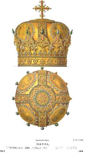 | Keywords: Drevnosti RG v1 ill092.jpg ru Д евности Российского госуда ства Antiquities of Russian country 1846 1853 Т 1 Иллюст ато Солнцев Фёдо Г иго ьевич ит а п исланная из Г еции пат иа ху икону ит а эта названная в описи ко оной по п еданию п ислана к икону из Г еции где уже известно было имя и влияние на дела московского пе восвятителя Фо ма ее соответствует этому названию а богатство азнооб азных узо очий ее назначению в пат иа шем служении ознаменованном то жественностью и великолепием Основу мит ы составляет се еб яная вызолоченная доска на коей положено пе ек естье запоны и епьи из азных д агоценных камней и жемчугов а ве хушке две восьмиугольные звезды вставленные одна в д угую служат подножием четы ехконечному к есту из че вчатых яхонтов и изум удов Вок уг звезд на финифтяном ободке изоб ажена из Псалма XX 4 «Положил если на главе его венец от камене честна Живота п осил есть у тебе и дал еси ему в долготу дний Блаженнейшего пат иа ха великого г ада осквы и всея России Господина икона знамение 1653» Хотя об аза на мит е г еческого дела и письмена на них г еческие но из самой надписи не видно что ко она эта п ислана из Г еции икону Пат иа ху вско е по вступлении его на святительской п естол Ве оятнее она доставлена от вселенских пат иа хов одному из п едшественников икона а им она только ук ашена д агоценными камнями и г еческой надписью; потому что он и д угие д евнейшие утва и своих п едшественников запечатлел своим именем ежду пе ек естьем на четы ех золотых плащах или клеймах вычеканены и наведены че нью св евангелисты с г еческими написаниями их имен и начала Евангелий у каждого ад нижним венцом возвышаются двенадцать го одков или епьев из жемчугов изум удов и яхонтов п едставляющих подобие к инов лилий и числом своим намекающих на двенадцать апостолов Весом эта мит а 5 ф Сходная с ней и как ве оятно по об азцу ее сделанная также кованая мит а есть да пат иа ху от ца я Алексея ихайловича и ца ицы а ии Ильиничны как показывают самые надписи на ней и финифтяные об аза св Алексия Божиего человека и а ии Египетской им тезоименитых С того в емени асп ост анились мит ы златокованные кото ые заменили п ежние мягкие; они жалуемы были как особые п еимущества а хие еям и даже а химанд итам 1846 1853 http //www runiverse ru/bookreader/book403605/ page/61/mode/1up Солнцев Фёдо Г иго ьевич PD-Art Antiquities of Russian country - Volume I Files uploaded by Shakko from various sources Uploaded with UploadWizard Patriarch Nikon's items 17th-century Orthodox mitres 1653 works |