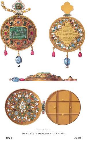 | Keywords: Drevnosti RG v1 ill109.jpg ru Д евности Российского госуда ства Antiquities of Russian country 1846 1853 Т 1 Иллюст ато Солнцев Фёдо Г иго ьевич Панагия пат иа ха Иоасафа ежду великокняжескими и ца скими егалиями в О ужейной палате находится и пат иа шая панагия п ек асная по аботе и д агоценная по мате иалам Лицевую ее сто ону ук ашает оп авленный в золото камей из большого х изоп аза на коем вы езан об аз Успения Богомате и х амовой Пат иа хии Г еческая надпись обна уживает г еческое изделие кото ое московским художником вставлено в панагию ук ашено д агоценными камнями и финифтью ознаменовано усскими надписями С об атной сто оны отк ывается половинка на коей наведены че нью следующие надписи к естооб азно азмещенные и мощи святого мученика Евстафия Плакиды святого мученика е ку ия п еподобного Александ а Сви ского великомученика Пантелеймона В се едине читаете Лtта /--з `од повелtнїемъ Великаго Гспд`на Святtйшаго Iоасафа Пат їа ха осковскаго ї всеа Росиї здtлана сїя панагtя Год 1671 показывает что она п инадлежала седьмому пат иа ху осковскому Иоасафу II хи отонисанному из а химанд итов Т оице-Се гиевой лав ы 29 декаб я 1667 г и скончавшемуся 17 фев аля 1672 г еизвестно только по какому случаю этот знак святительства поступил в О ужейную палату а не в Пат иа шую изницу 1846 1853 http //www runiverse ru/bookreader/book403605/ page/61/mode/1up Солнцев Фёдо Г иго ьевич PD-Art Files uploaded by Shakko from various sources Antiquities of Russian country - Volume I Panagias Uploaded with UploadWizard Joasaphus II |